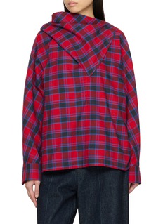 This long-sleeved top plays with classic plaid through an unexpected, sculptural gesture. A layered panel drapes diagonally across the shoulder, introducing movement and quiet tension to an otherwise familiar silhouette. Wear it loose over denim to offset the graphic checks with ease.