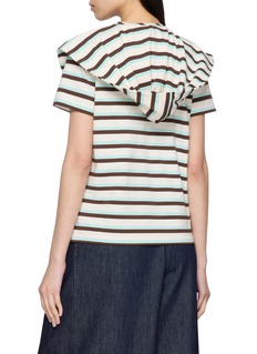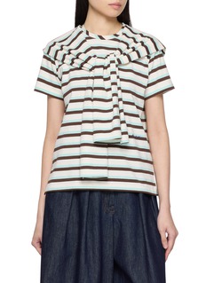 A graphic play on layering, this striped short-sleeve tee features a sculptural draped panel that echoes a scarf-like silhouette, finished with a soft hood at the back. Fluid yet structured, it lends a considered twist to everyday dressing—ideal with wide-leg denim or tailored trousers for understated statement styling.