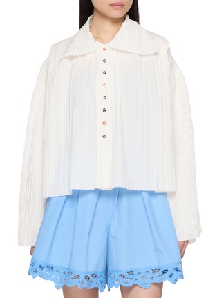 EENK transforms the classic shirt into a weightless statement with finely pressed pleats and a cape-like overlay that floats with every step. The sculptural collar and jewel-toned buttons lend subtle character—style it over tailored shorts or wide-leg trousers for modern polish.