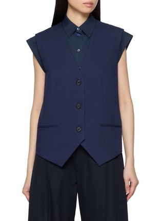 Blurring boundaries between shirting and tailoring, this vest from EENK is designed with an integrated shirt front beneath a clean, sleeveless silhouette. Precision-cut panels and a deep V opening lend quiet structure, ideal for refined layering from workwear to evening settings.