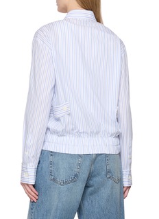 This EENK striped blouse is a fresh take on classic tailoring. Crafted from crisp, lightweight fabric, it features a charming blue and white stripe pattern that exudes a sense of effortless elegance. The unique front zip closure adds a modern twist to the traditional collared design, while the cinched waistline provides a flattering silhouette.