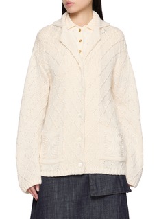 Crafted with a softly structured hand, this textured knit cardigan showcases EENK’s quiet mastery of pattern and proportion. The diamond stitch lends depth and warmth to the cotton knit, while the gently relaxed silhouette layers effortlessly over dresses or tailored separates for refined everyday ease.