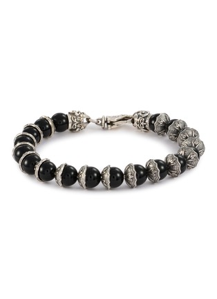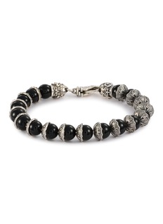 This Emanuele Bicocchi bracelet masterfully combines sterling silver with black onyx beads to create a look that is both edgy and sophisticated. The detailed silver beads are carved with starburst and floral patterns, adding a touch of intricate craftsmanship to the piece.
