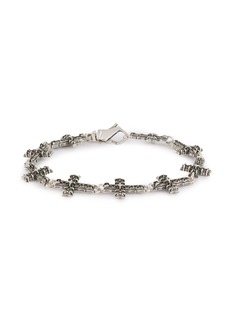 This Emanuele Bicocchi bracelet showcases an intricate design of sterling silver links, each meticulously crafted to resemble miniature architectural marvels. The bracelet combines robust charm with delicate artistry, making it a versatile addition to both casual and formal looks. Its unique style and detailed craftsmanship are emblematic of the Emanuele Bicocchi brand's commitment to luxury and distinctive design.