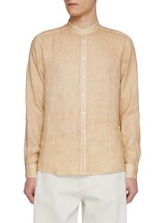 This Equil shirt captures effortless refinement with its mandarin collar and airy linen weave. Its crisp silhouette in a sun-washed hue makes it a versatile staple—perfect for warm-weather tailoring or layered under light knits on cooler nights.