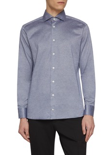 In a deep, heathered blue, this Filo di Scozia jersey shirt introduces a richer, more textured expression of refined knitwear. The naturally lustrous cotton enhances the shade’s depth, delivering a sleek, breathable layer that transitions effortlessly from tailored evenings to relaxed weekend pairings.