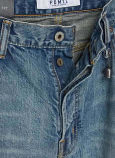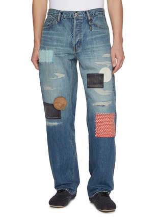 FDMTL's straight-leg jeans showcase an eclectic array of hand-applied boro patches—from geometric grids to circular appliqués—blended with intentional distressing and sashiko repairs. The vintage-washed silhouette balances contrasting textures and patterns across both legs. Wearable art that celebrates Japanese mending traditions through contemporary denim craftsmanship.
