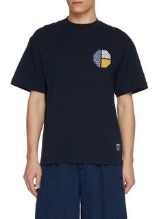 FDMTL's distinctive T-shirt features an embroidered circular chest patch showcasing mixed sashiko patterns in geometric quadrants. The relaxed fit offers effortless everyday style with subtle hem branding. A collectible wardrobe essential that celebrates Japanese textile artistry through intricate handcrafted detailing