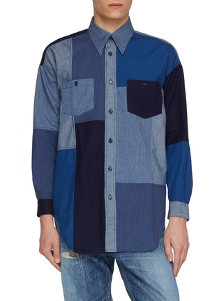 FDMTL's signature patchwork shirt showcases varied weave textures and patterns in bold paneling with dual chest pockets. The relaxed, oversized silhouette features classic point collar and button-front closure for versatile layering. An artistic expression of Japanese boro heritage reimagined as contemporary menswear.