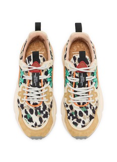 Step into a world of eclectic style with these FLOWER MOUNTAIN sneakers, a perfect blend of bold patterns and versatile functionality. These sneakers feature a striking mix of animal print and vibrant suede panels in shades of beige and orange, accented with teal and cream laces for a splash of color. The breathable mesh inserts and robust rubber soles provide both comfort and traction, making them ideal for any adventure. Whether paired with casual jeans or active wear, these sneakers are sure to make a statement.