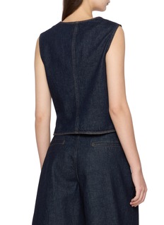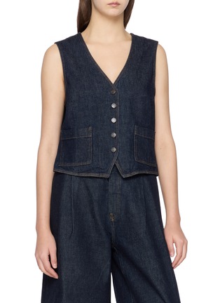 Refined and sharply cut, this vest distils FRAME’s tailoring sensibility into a sleek denim essential. Crafted from regenerative non-stretch denim, it features clean button closures and patch pockets—perfect layered solo or paired with matching shorts for modern polish.