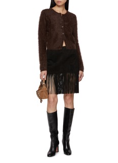 Cut from supple calf suede, this skirt is defined by its long fringed hem, evoking Western classics with contemporary edge. The clean, structured waist contrasts with the playful movement of the fringe, making it an effortless statement paired with boots or tailored knits.