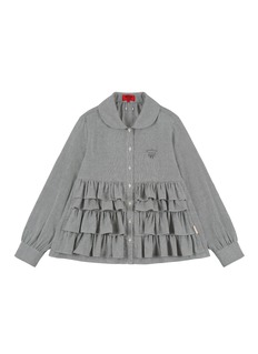 A romantic reinterpretation of classic shirting, this long-sleeve shirt layers delicate ruffles across a softly structured silhouette. Finished with star-shaped buttons and subtle embroidery, GOODBAI blends playful nostalgia with everyday wearability—perfect for styling with denim or tailoring for a gentle contrast.