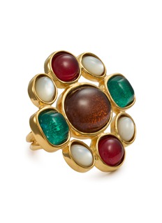 Artisan elegance shines in the Bohème ring, where lustrous hues and a radiant central stone create a captivating interplay of light and texture. The sculptural gold-toned framework adds a touch of vintage charm, making it a statement piece for those who embrace bold, eclectic sophistication.