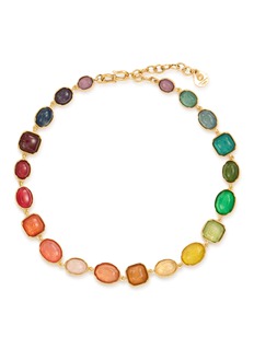 This statement necklace creates a mesmerising seascape with its array of cabochons. Each stone is meticulously set in gilded bezels, forming a graduated celebration of captivating hues that encircles the neckline with sophisticated drama.