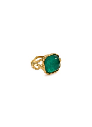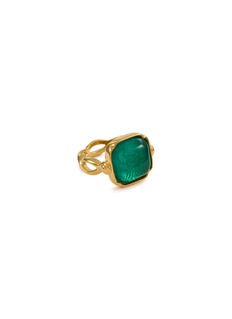 This statement ring showcases a rich green cabochon in a geometric setting. The interplay between its rounded stone and square cut creates a sophisticated silhouette, whilst the cabochon captures and reflects light with mesmerising depth.