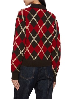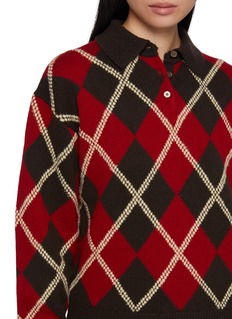 Reimagined in rich burgundy and chocolate brown with ivory accents, this Collegiate polo shirt delivers a bolder take on the classic argyle motif. Crafted from a soft wool-cashmere blend, it brings heritage charm with a spirited edge—ideal for layering over denim or pleated skirts.