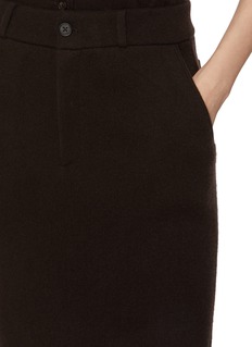 Minimalism takes centre stage with this tailored skirt, spun from pure cashmere in a deep, refined tone. Designed with a clean column silhouette, discreet belt loops, and practical pockets, it offers a polished balance of comfort and structure—perfect for day-to-night elegance.