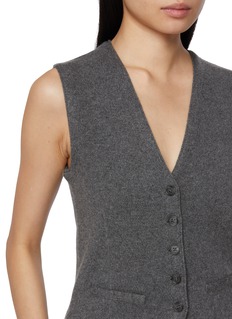 This tailored vest offers a refined take on a timeless silhouette, cut in pure cashmere for an elevated feel. Designed with a deep V-neckline, button front, and welt pockets, it balances classic menswear tailoring with modern softness. A back cinch detail allows for subtle shaping, making it versatile for layering over shirts or wearing solo.