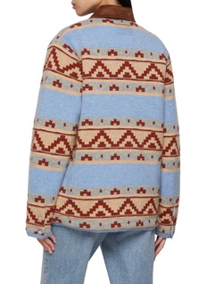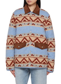Blending Western influences with industrial utility, this jacket is spun from a wool–cashmere blend patterned in bold geometric stripes. Accented with a corduroy collar and flap pockets, it delivers both warmth and character, making it a standout for everyday layering.