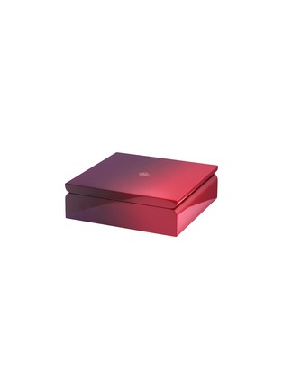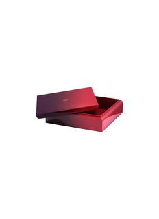 Luxury meets whimsy in Hanoia’s square box, where a gradient lacquer finish shifts from deep burgundy to vibrant red, creating a dramatic allure. The sleek, modern silhouette and gold-toned logo add a touch of sophisticated playfulness, making it the perfect vessel for sweet indulgences and elegant gifting.