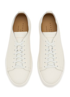 Discover the epitome of minimalistic luxury with Henderson's exclusive white leather sneakers. These sneakers are meticulously crafted from premium leather, offering both supreme comfort and enduring style. The subtle texture of the leather, combined with a sleek, streamlined silhouette and matching white laces, ensures a versatile look that complements any outfit.
