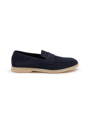 These Henderson loafers showcase impeccable craftsmanship and contemporary design. Crafted from premium navy suede, the loafers feature a sleek, minimalist silhouette accented with a contrasting strap for a touch of modern elegance. The soft suede upper pairs seamlessly with the lighter, cushioned sole, offering both comfort and style.