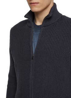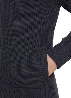 This Herno cardigan merges classic knitwear with technical innovation. Crafted from plush Merino wool, it features a detachable nylon hood and bib for adaptable layering. A dual zip closure and ribbed texture complete its sleek, transitional design for modern city dressing.