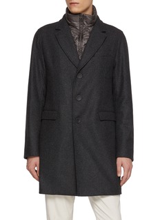Rendered in a deep charcoal tone, this Herno coat refines everyday outerwear with its tailored precision and detachable quilted bib. Crafted from a textured wool blend, it offers both warmth and structure—perfect for elevating layered winter looks with modern sophistication.