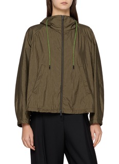 A featherlight layer shaped with Herno’s signature technical finesse, this hooded windbreak jacket plays with volume through its cropped, wide silhouette and crisp nylon sheen. Neon drawcords punctuate the look with subtle energy. Ideal for transitional days or layered over tailoring for a clean, modern contrast.