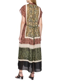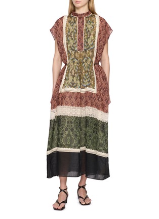 INTO THE EAST designs are rooted in Eastern philosophy, with a focus on effortless elegance and mindful craftsmanship. Rendered in alternating ornate patterns with contrast lace trims, this dress exudes an artisanal yet whimsical allure.