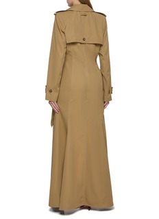 Jean Paul Gaultier reconfigures the classic trench with a provocative architectural cut, unveiling the legs beneath a sharply tailored, floor-sweeping silhouette. Structured shoulders, a storm flap and a low-slung belt heighten the drama—balancing couture precision with audacious attitude for evening layering or statement daywear.