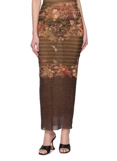 A fluid column of illusion, this long skirt layers Jean Paul Gaultier’s signature marinière with painterly grape motifs in translucent mesh. Light-catching and sensuous, it moves effortlessly from day to night—style with a fitted baby tee or a tailored jacket for contrast.