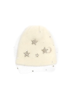 Seamlessly blending classic beauty with modern sensibility, the Ahra Violette Beanie from Jennifer Behr is anything but basic. Featuring embellished stars and a single moon atop a crystal embellished veil, this celestial piece elevates any look and adds a touch of glamour and edge to any occasion.
