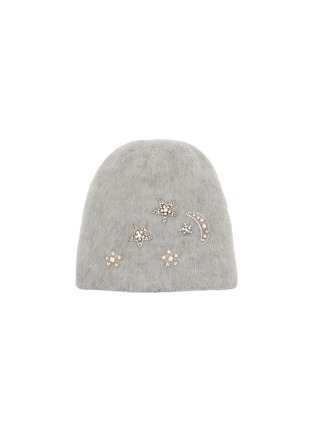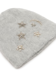 This Jennifer Behr beanie is a luxurious blend of style and warmth, crafted in a serene grey wool that offers both comfort and elegance. The subtle hue makes it a versatile addition to any winter wardrobe, easily paired with a variety of colors and styles. Embellished with delicate, crystal-encrusted stars and a crescent moon, this beanie not only keeps you warm but also adds a touch of glamour and whimsy to your cold-weather outfits. It's perfect for those who love a hint of sparkle and want to maintain a sophisticated look even in the chilliest months.