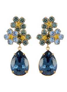 Introducing the Lauretta Earrings, handcrafted in New York, these earrings feature pear-shaped Austrian crystal drops delicately suspended from a blossoming cluster of flowers, creating a lush garden effect. Set in an 18k gold-plated frame, the Lauretta Earrings are poised to become a treasured heirloom.