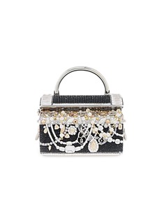 Unveil the luxury of the Abundance Treasure Chest crystal handbag in black and gold. Covered in a stunning array of black and gold crystals, this striking piece features golden gems and pearls overflowing from the chest, creating a captivating display of luxury.