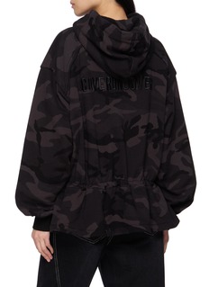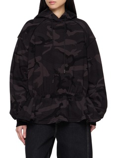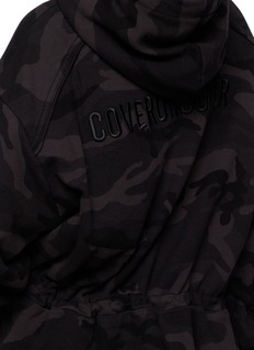 This Juun.J hoodie merges utilitarian codes with sculptural volume. Rendered in soft cotton with a tonal camouflage motif, it features an adjustable drawstring hem and “COVERUNCOVER” embroidery at the back—a refined streetwear piece that balances form, texture, and comfort.