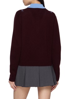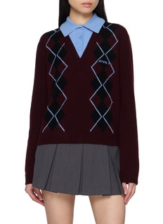 This Juun.J pullover merges collegiate tradition with refined craftsmanship. Featuring a bold argyle pattern and a tonal knit collar patch, the V-neck design introduces a layered illusion—ideal for pairing with pleated skirts or tailored separates for a preppy-meets-modern edge.