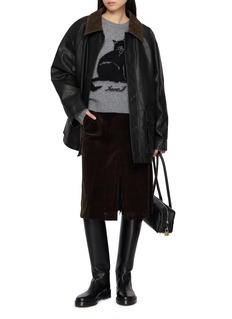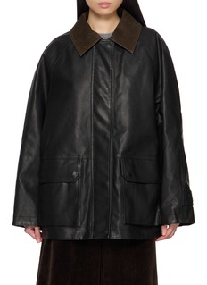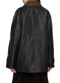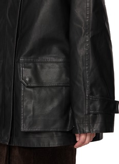 With Juun.J’s signature oversized silhouette, this faux leather jumper jacket balances utilitarian structure with refined detailing. The contrast suede collar lends tactile depth, while the minimalist finish exudes modern toughness—perfect for layering through shifting seasons.