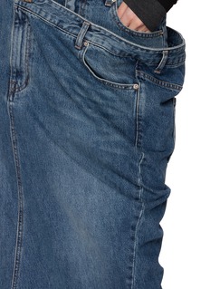 A study in deconstruction, this Juun.J denim skirt reinterprets the classic silhouette through illusion layering. The double waistband detail mimics draped denim trousers, creating a bold architectural line—perfect for juxtaposing with sleek knits or tailored outerwear.