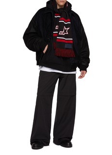 An exploration of material tension, this Juun.J jacket merges the softness of textured denim with the supple tactility of faux leather sleeves. The oversized silhouette and tonal finish embody a quiet confidence, while the snap-button front and ribbed trims infuse a touch of athleticism. A masterful blend of luxury and street sensibility.