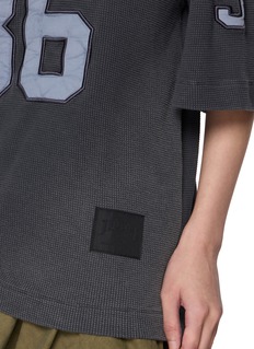 A statement of collegiate ease, this Juun.J overdyed T-shirt reinterprets classic sports graphics through a textured lens. Crafted from heavyweight cotton jersey, it features tactile varsity appliqués and a washed finish—perfect for pairing with structured skirts or relaxed denim.