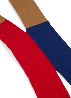 Wrap yourself in the vibrancy of J.W. Anderson's color-block scarf, a stunning accessory that combines practical warmth with artistic flair. Crafted from a soft, luxurious fabric, this scarf features bold panels of camel, red, and blue, creating a striking visual contrast that makes it a standout piece. Ideal for adding a pop of color to your winter wardrobe, this scarf not only offers comfort but also injects a touch of J.W. Anderson's signature eclectic style into any ensemble.
