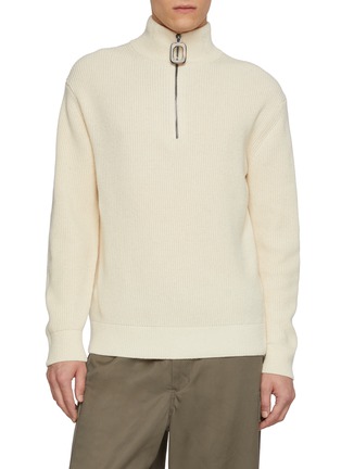 Embrace the minimalist charm of this J.W. Anderson ivory turtleneck sweater, a perfect blend of comfort and style. Crafted from a plush knit fabric, this piece offers warmth and softness ideal for cooler days. The distinctive half-zip closure with an elegant silver-tone ring pull adds a modern, sophisticated touch to the classic turtleneck design. This sweater's neutral ivory color makes it a versatile choice for layering under jackets or wearing alone for a clean, refined look.