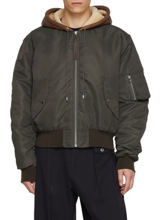 This J.W. Anderson bomber jacket merges utilitarian function with luxurious comfort. The dark olive hue lends an understated elegance, while the plush shearling-lined hood provides warmth and a touch of opulence. Crafted from a durable, water-resistant fabric, this jacket is ideal for adverse weather conditions. It features multiple zippered pockets for practical storage and a central zip closure for easy wear. The ribbed cuffs and hem ensure a snug fit, keeping the elements out.
