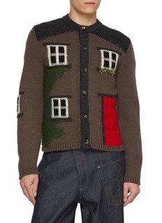 This J.W. Anderson cardigan presents a captivating narrative through its whimsical and detailed knit design, featuring charming house motifs that bring a playful and artistic edge to traditional knitwear. The earthy brown base is complemented by intricate, colorful details such as green shrubbery and a vivid red door, making each element pop. Constructed from premium, soft wool, this cardigan offers both warmth and comfort, ideal for layering in cooler weather. Its classic button-front design ensures versatility and ease of wear.