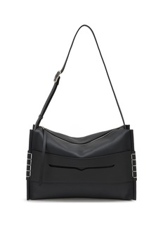 This J.W. Anderson shoulder bag exemplifies minimalist elegance with its sleek black leather and structured silhouette. The bag features distinctive silver-tone hardware accents along the strap, adding a modern touch to its classic design.