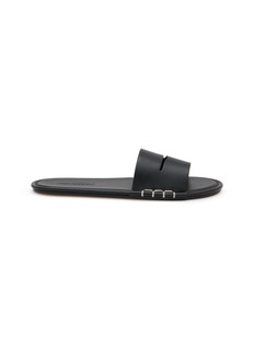 This sleek J.W. Anderson slide offers a sophisticated, minimalist design with its smooth black leather strap and distinctive silver-tone hardware details. Perfect for effortlessly elevating your casual summer wear, the slides feature a comfortable, molded footbed that promises all-day comfort.