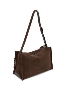 This J.W. Anderson shoulder bag epitomizes understated luxury with its rich chocolate suede construction and elegant design. The bag is accentuated with striking silver-tone hardware on the straps, adding a touch of modernity to its sleek profile.
